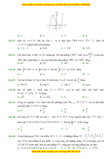 Câu 15: Trong không gian Oxyz, mặt phẳng nào dư i ớ đây song song v i ớ m t ặ ph ng ẳ ( Oxy) ? A. ( a) : z 1 + = 0 . B. ( j ) : x 1 + = 0 . C. ( ) b : x + z 1 + = 0 . D. ( ) g : y 1 + = 0 . Câu 16: Cho phư ng ơ trình x x 1 4 2 + + - 3 = 0 . Khi đặt 2x t = ta đư c ợ phư ng ơ trình nào sau đây? A. 2 t +2t - 3 = 0 . B. 2 2t - 3t = 0 . C. 2 t +t - 3 = 0 . D. 4t - 3 = 0 . Câu 17: M t ộ h p