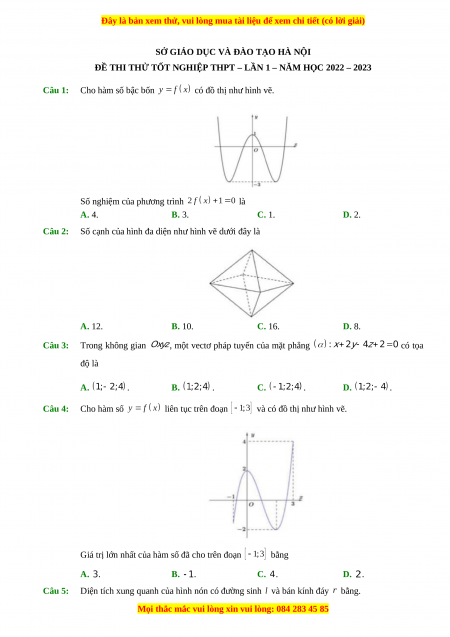 ĐỀ THI THỬ TỐT NGHIỆP THPT – LẦN 1 – NĂM HỌC 2022 – 2023 Câu 1: Cho hàm số bậc bốn