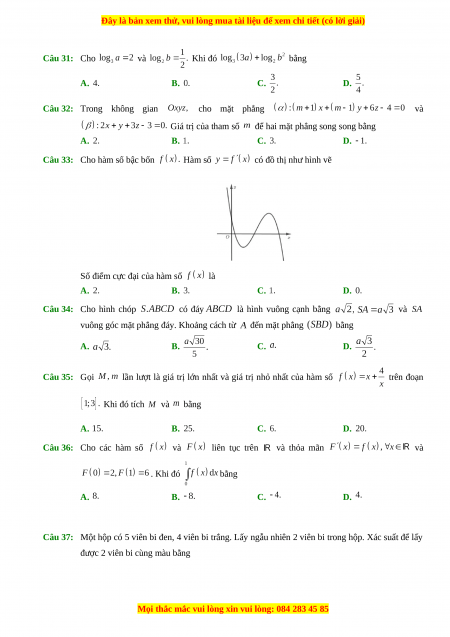 Câu 33: Cho hàm số bậc bốn Hàm số có đồ thị như hình vẽ
