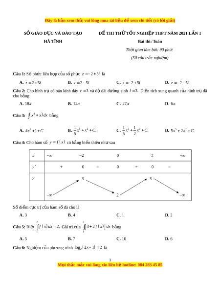 Đây là bản xem th , vu ử i lòng mua tài li u ệ đ xe ể m chi ti t ế (có l i ờ gi i ả ) SỞ GIÁO D C Ụ VÀ ĐÀO T O Ạ Đ Ề THI TH Ử T T Ố NGHI P Ệ THPT NĂM 2021 L N Ầ 1 HÀ TĨNH Bài thi: Toán Th i