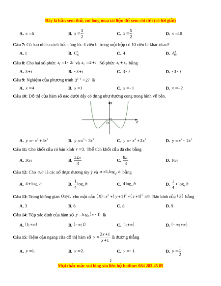 ố cùng lúc 4 viên bi trong m t ộ h p c ộ ó 10 viên bi khác nhau? A. 1 B. 4 C C. 4! D. 4 A 10 10 Câu 8: Cho hai s ph ố c ứ z 1 2i z 2 i z z 1 và 2 . S ph ố c ứ 1 2 bằng A. 3 i B. 3 i C. 3 i D. 3 i Câu 9: Nghiệm c a ủ phư ng t ơ rình x1 3 2 7 là A. x 4 B. x 1 C. x 1 D. x 2 Câu 10: Đ t ồ hị c a ủ hàm s nà ố o dư i ớ đây có d ng nh ạ đ ư ư ng ờ cong trong hình v bê ẽ n. A. 3 2