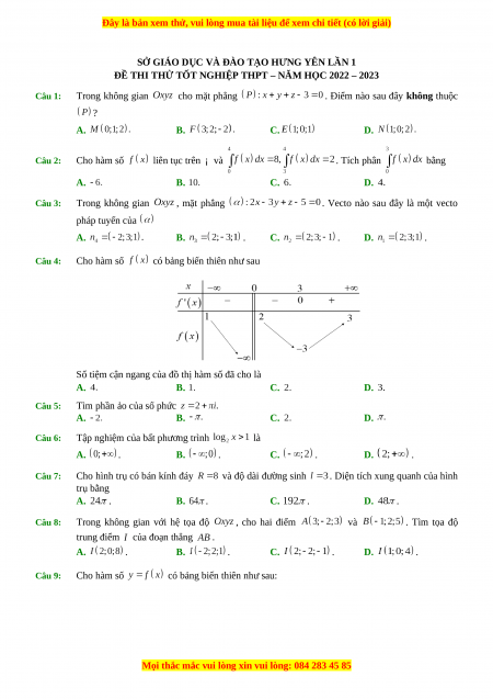Đề thi thử Toán Sở Hưng Yên năm 2023