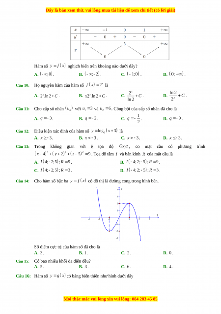 . Tọa độ tâm và bán kính của mặt cầu là A. . B. . C. . D. . Câu 14: Cho hàm số bậc ba