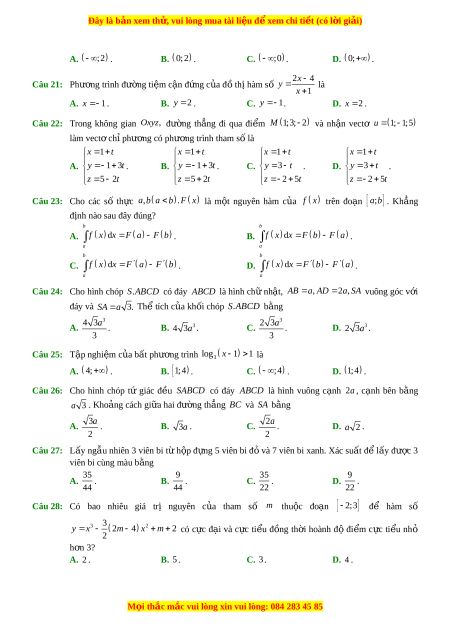 ố chóp S.ABCD bằng 3 4 3a 3 2 3a A. . B. 3 4 3a . C. . D. 3 2 3a . 3 3 Câu 25: Tập nghi m ệ c a ủ bất phư ng