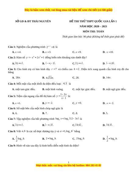 Đề thi thử Toán Sở Thái Nguyên lần 1 năm 2021