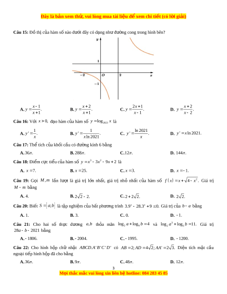 ử vui lòng mua tài li u ệ đ ể xem chi ti t ế (có l i ờ gi i) ả Câu 15: Đ t ồ hị c a ủ hàm s nà ố o dư i ớ đây có d ng nh ạ đ ư ư ng ờ cong trong hình bên? x 1 x 2 2x 1 x 2 A. y . B. y . C. y . D. y . x 1 x 1 x 1 x 2 Câu 16: V i