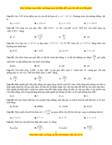 ử vui lòng mua tài li u ệ đ ể xem chi ti t ế (có l i ờ gi i) ả Câu 23: G i ọ , A B là hai đi m ể c c ự tr c ị a ủ đ ồ th ịhàm s ố 3 2