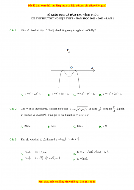 Hàm số nào dưới đây có đồ thị như đường cong trong hình dưới đây? A. B. C. D. Câu 2: