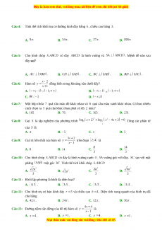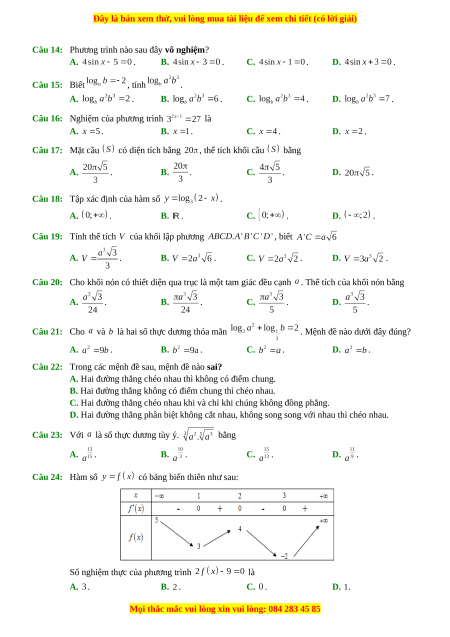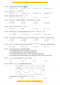 Câu 16: Nghiệm của phương trình là A. . B. . C. . D. . Câu 17: Mặt cầu có diện tích bằng , thể tích khối cầu bằng A. . B. . C. . D. .