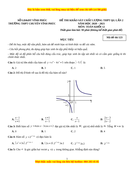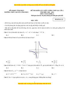 TRƯỜNG THPT CHUYÊN VĨNH PHÚC NĂM H C Ọ 2020 – 2021 MÔN: TOÁN KHỐI 12 Th i