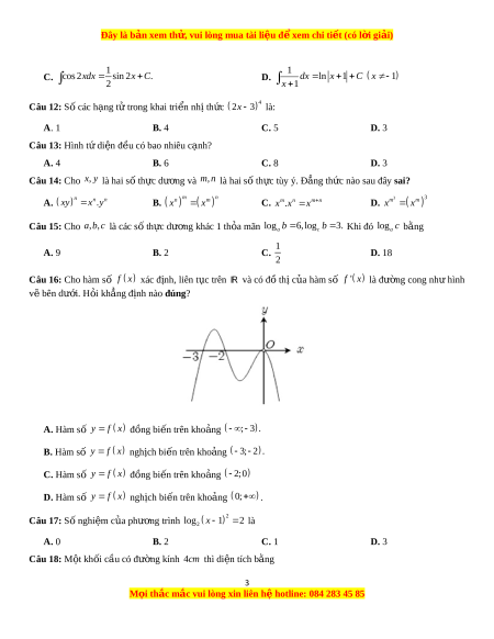ố f ' x là đư ng ờ cong nh hì ư nh v bê ẽ n dư i ớ . H i ỏ khẳng đ nh ị nào đúng? A. Hàm s