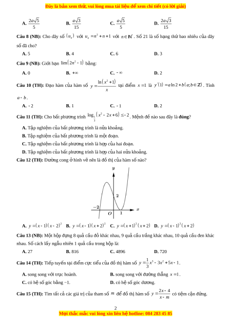 ề nào sau đây là đúng? 3 A. Tập nghi m ệ c a ủ bất phư ng t ơ rình là n a ử kho ng. ả B. Tập nghi m ệ c a ủ bất phư ng ơ trình là m t ộ đo n. ạ C. Tập nghi m ệ c a ủ bất phư ng t ơ rình là h p c ợ a ủ hai đo n. ạ D. Tập nghi m ệ c a ủ bất phư ng t ơ rình là h p c ợ a ủ hai n a ử kho ng. ả Câu 12 (TH): Đư ng c ờ ong hì ở nh v nê ẽ n là đồ th c ị a ủ hàm s nà ố o? A. y 2 2