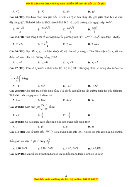 Câu 23 (NB): Có bao nhiêu cách ch n ọ m t ộ bạn làm l p ớ trư ng ở và m t ộ b n l ạ àm l p ớ phó t m ừ t ộ l p ớ h c ọ g m ồ 35 h c ọ sinh, bi t ế r ng e ằ m nào cũng có kh nă ả ng làm l p t ớ rư ng ở và l p ớ phó? 3 M i ọ thắc m c