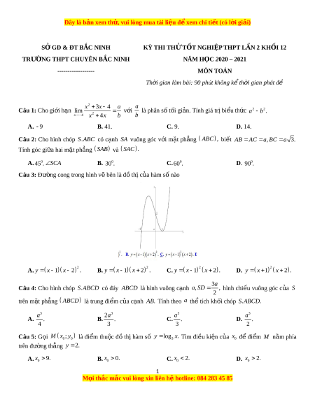 Đây là bản xem th , vu ử i lòng mua tài li u ệ đ xe ể m chi ti t ế (có l i ờ gi i ả ) SỞ GD & ĐT B C Ắ NINH KỲ THI TH Ử T T Ố NGHI P Ệ THPT L N Ầ 2 KH I Ố 12