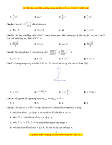 Câu 26: Tìm tập nghi m ệ S c a ủ phư ng ơ trình là 2021 2020 A. S 3 . B. S 1 . C. S 3 . D. S 1 . Câu 27: Đư ng c ờ ong trong hình bên là đ t ồ hị c a ủ hàm s nà ố o trong b n hà ố m s d ố ư i ớ đây? x 1 A. 3 y l og . x x y . B. 1 C. y . y l og . x D. 3 3 3 Câu 28: S nghi ố ệm c a ủ phư ng ơ trình log x log x 0 2020 2021 là A. 0. B. 3. C. 2. D. 1. Câu 29: Cho hàm s