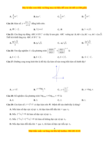 Đây là bản xem th , vu ử i lòng mua tài li u ệ đ xe ể m chi ti t ế (có l i ờ gi i ả ) 4 1 4 A. 3 r . B. 3 4 r . C. 3 r . D. 2 r . 3 3 3 2x 5 Câu 24: Hàm s ố y đ ng ồ bi n t ế rên: x 2 A. \ 2 . B. 2; C. D. ; 2 .