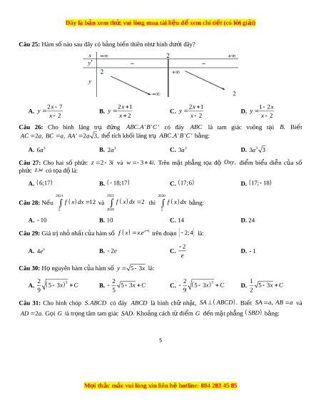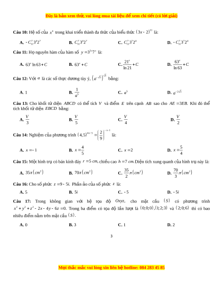 Đây là bản xem th , vu ử i lòng mua tài li u ệ đ xe ể m chi ti t ế (có l i ờ gi i ả ) Câu 10: H s ệ ố c a ủ 4 x trong khai tri n t ể hành đa th c ứ c a ủ bi u t ể h c ứ x 11 3 2 là: A. 7 4 7 C 3 2 B. 7 4 7 C 3 2 C. 7 7 4 C 3 2 D. 7 7 4 C 3 2 11 11 11 11 Câu 11: H nguyê ọ n hàm c a ủ hàm s ố 2 3 x7x y là: 21x 63x