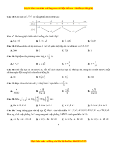 Câu 19: Có bao nhiêu s t ố nhi ự ên có 6 chữ s phâ ố n bi t ệ lập t c ừ ác ch s ữ ố 1, 2,3, 4,5,6? A. 360 B. 6 C. 720 D. 1 1 Câu 20: Nghiệm c a ủ phư ng t ơ rình log x 3 là: 3 1 1 A. x 2 7 B. 3 x 3 C. x D. x 3 27 Câu 21: M t ộ l p ớ h c ọ có 18 nam và 12 n . ữ S ố cách ch n ọ hai b n ạ t ừ l p ớ h c ọ đó, trong đó có m t ộ nam và m t ộ nữ tham gia đ i ộ xung kích c a ủ nhà trư ng ờ là: A. 30 B. 2 2 C .C C. 2 C D. 216 18 12 20