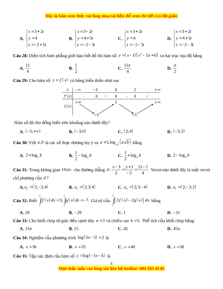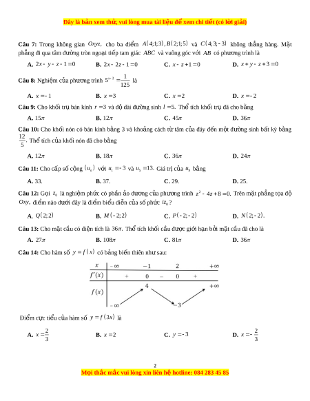 D. x y z 3 0 x 1 Câu 8: Nghiệm c a ủ phư ng t ơ rình 2 5 là 125 A. x 1 B. x 3 C. x 2 D. x 2 Câu 9: Cho kh i ố tr bá ụ n kính r 3 và đ dà ộ i đư ng s ờ inh l 5 . Thể tích kh i ố trụ đã cho bằng A. 15 B. 12 C. 45 D. 36 Câu 10: Cho kh i ố nón có bán kính b ng ằ 3 và kho ng ả cách từ tâm c a ủ đáy đ n ế m t ộ đư ng ờ sinh b t ấ kỳ b ng ằ 12 . Thể tích c a ủ kh i ố nón đã cho b ng ằ 5 A. 12 B. 18 C. 36 D. 24 Câu 11: Cho cấp s c ố ng ộ u u 3 u 1 3. u n v i ớ 1 và 5 Giá trị c a ủ 9 bằng A. 33. B. 37. C. 29. D. 25. Câu 12: G i ọ z0 là nghi m ệ ph c ứ có ph n ầ o ả dư ng ơ c a ủ phư ng ơ trình 2 z 4z 8 0 . Trên mặt ph ng ẳ t a ọ độ Oxy, điểm nào dư i ớ đây là đi m ể bi u di ể n ễ c a ủ s ph ố c ứ iz0 ? A. Q 2; 2