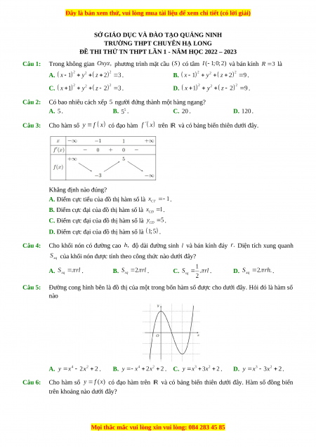 Đề thi thử Toán trường Chuyên Hạ Long - Quảng Ninh lần 1 năm 2023