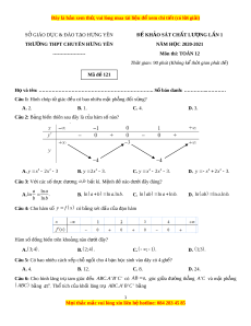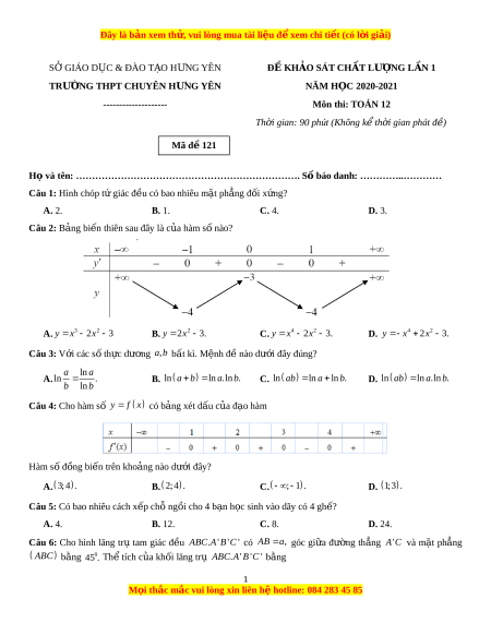 Đây là bản xem th , vu ử i lòng mua tài li u ệ đ xe ể m chi ti t ế (có l i ờ gi i ả ) S G Ở IÁO D C & Ụ ĐÀO T O Ạ H N Ư G YÊN Đ K Ề H O Ả SÁT CH T Ấ LƯ N Ợ G L N Ầ 1 TRƯ N Ờ G THPT CHUYÊN H N Ư G YÊN NĂM H C Ọ 2020-2021 -------------------- Môn thi: TOÁN 12 Th i