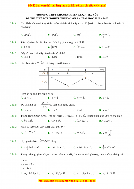 Đề thi thử Toán trường Chuyên KHTN Hà Nội lần 1 năm 2023