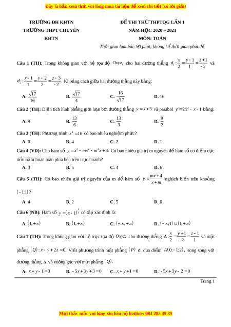 Đây là bản xem th , vu ử i lòng mua tài li u ệ đ xe ể m chi ti t ế (có l i ờ gi i ả ) TRƯ N Ờ G ĐH KHTN Đ Ề THI TH Ử THPTQG L N Ầ 1 TRƯỜNG THPT CHUYÊN