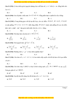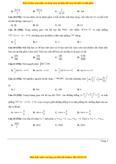 . Khoảng cách từ điểm A đến mặt phẳng P bằng: 2 A. B. 2 C. 3 D. 1 3 Câu 20 (TH): M t ộ l p ớ h c ọ có 30 h c ọ sinh nam và 10 h c ọ sinh n . ữ Giáo viên ch ủ nhi m ệ c n ầ ch n ọ m t ộ ban cán s l ự p ớ g m ồ 3 h c ọ sinh. Tính xác su t ấ đ ba ể n cán s l ự p c ớ ó c na ả m và n . ữ 435 135 285 5750 A. B. C. D. 988 988 494 9880