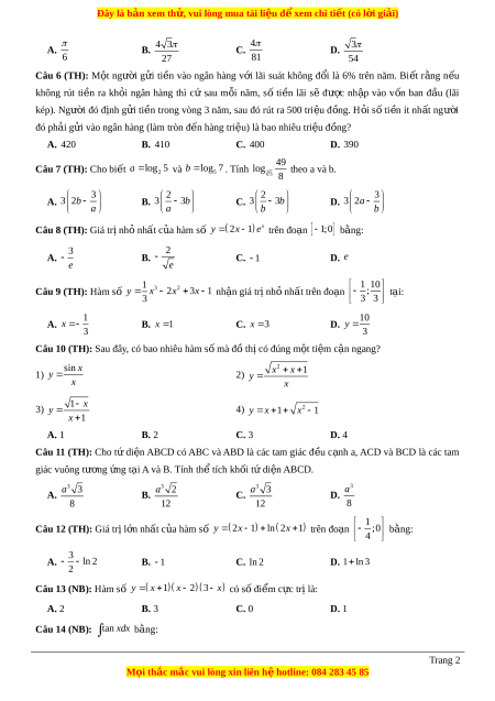 Đây là bản xem th , vu ử i lòng mua tài li u ệ đ xe ể m chi ti t ế (có l i ờ gi i ả ) 4 3 4 3 A. B. C. D. 6 27 81 54 Câu 6 (TH): M t ộ ngư i ờ g i ử ti n ề vào ngân hàng v i ớ lãi suát không đ i ổ là 6% trên năm. Bi t ế r ng ằ n u ế không rút ti n ề ra kh i