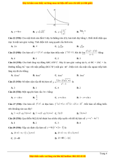 ứ ABC.A’B’C’. Đáy là tam giác vuông t i ạ A, có BC = 2AC = 2a. Đư ng ờ thẳng AC’ t o ạ v i ớ m t ặ ph ng ẳ (BCC’B’) m t ộ góc 0 30 . Di n ệ tích c a ủ m t ặ c u ầ ngo i ạ ti p ế hình lăng tr đã ụ cho bằng; A. 2 12 a B. 2 6 a C. 2 4 a D. 2 3 a 2x 1 x 1 Câu 25 (VD): S t ố iệm cận c a ủ đ t ồ hị hàm s ố 2 y là: 2 x 1 A. 3 B. 1 C. 4 D. 2 Câu 26 (TH): M t ộ nguyên hàm c a ủ ln x bằng: 1