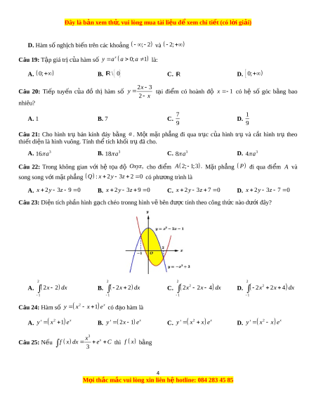 Đây là bản xem th , vu ử i lòng mua tài li u ệ đ xe ể m chi ti t ế (có l i ờ gi i ả ) Câu 14: Tìm m nh đ ệ đúng t ề rong các m nh đ ệ s ề au: A. Đ t ồ hị hàm s ố x y a và đ t ồ hị hàm s ố y l og x y . x a đ i ố x ng nha ứ u qua đư ng t ờ hẳng B. Hàm s ố x y a v i