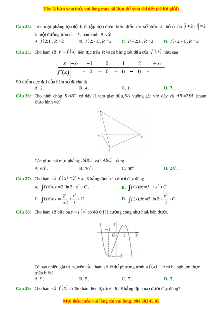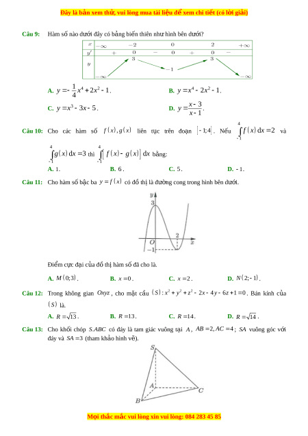 Đây là bản xem th , vu ử i lòng mua tài li u ệ đ xe ể m chi ti t ế (có l i ờ gi i ả ) Câu 9: Hàm s nà ố o dư i ớ đây có bảng bi n t ế hiên nh hì ư nh bên dư i ớ ? 1 A. 4 2 y x 2x 1. B. 4 2 y x 2x 1. 4 x 3 C. 3 y x 3x 5 . D. y . x 1 4