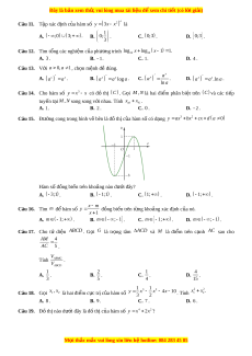 ọ tâm ACD và M là đi m ể trên c nh ạ AC sao cho AM 4 AC 5 . V Tính ABMG . VABCD 1 2 1 4 A. . B. . C. . D. . 3 5 4 15 1 1 3 2 2 2 Câu 18. G i ọ x , x x x . 1 2 là hai điểm c c ự tr c ị a ủ hàm s ố y x x 4x 10 3 2 . Tính 1 2 A. 8 . B. 9 . C. 7 . D. 6 . Câu 19. Đ t ồ hị nào dư i ớ đây là đ t ồ hị c a ủ hàm s ố 4 2