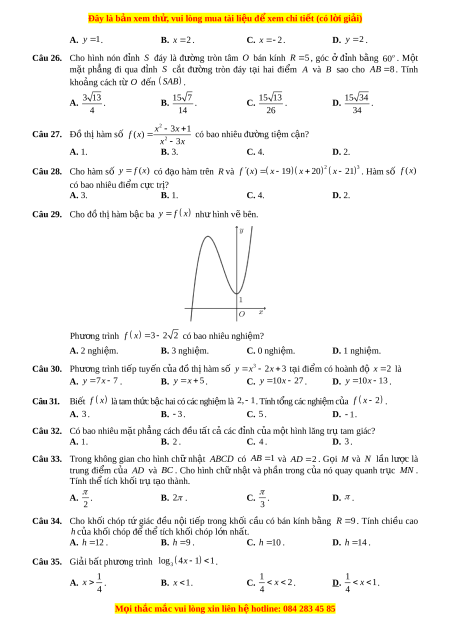 ừ O đến SAB . 3 13 15 7 15 13 15 34 A. . B. . C. . D. . 4 14 26 34 2 x 3x 1 Câu 27. Đ t ồ hị hàm s ố f (x) có bao nhiêu đư ng ờ ti m ệ cận? 2 x 3x A. 1. B. 3. C. 4. D. 2.