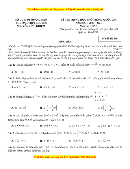 Đây là bản xem th , vu ử i lòng mua tài li u ệ đ xe ể m chi ti t ế (có l i ờ gi i ả ) SỞ GD & ĐT QU N Ả G NAM KỲ THI TRUNG H C Ọ PH Ổ THÔNG QU C Ố GIA TRƯỜNG THPT CHUYÊN NĂM H C Ọ 2020 – 2021 NGUY N Ễ B N Ỉ H KHIÊM Môn thi: TOÁN Th i