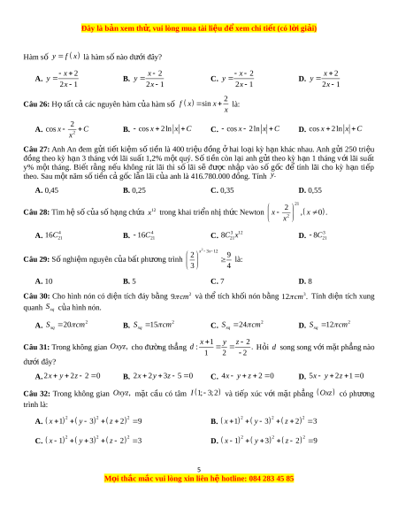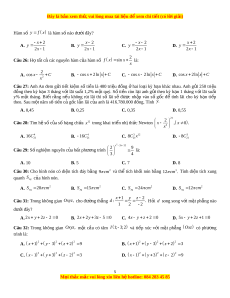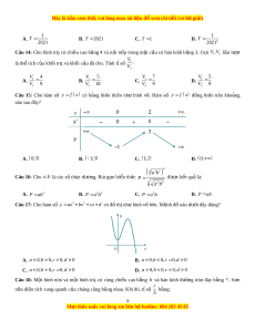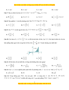 ợ gạch chéo trong hình v bê ẽ n. Khi 1 thì a thu c ộ khoảng nào dư i ớ đây? S 40 2 3 5 1 1 1 1 3 A. ; B. ; C. 0; D. ; 4 4 3 2 3 2 4 Câu 11: Đ t ồ hị hàm s nà ố o dư i ớ đây có đúng m t ộ đư ng ờ ti m ệ c n nga ậ ng? 2x 3 2 x 3x 1 4x 2 A. y B. y C. y D. y 2 x 2 1 2x 3 2 x 2x 1 x 3x 2 Câu 12: G i ọ z , z 2 1 2 là các nghi m ệ ph c ứ phân bi t ệ c a ủ phư ng