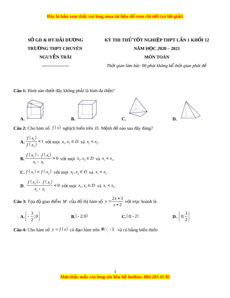 Đây là bản xem th , vu ử i lòng mua tài li u ệ đ xe ể m chi ti t ế (có l i ờ gi i ả ) SỞ GD & ĐT H I Ả DƯ N Ơ G KỲ THI TH Ử T T Ố NGHI P Ệ THPT L N Ầ 1 KH I Ố 12 TRƯỜNG THPT CHUYÊN NĂM H C