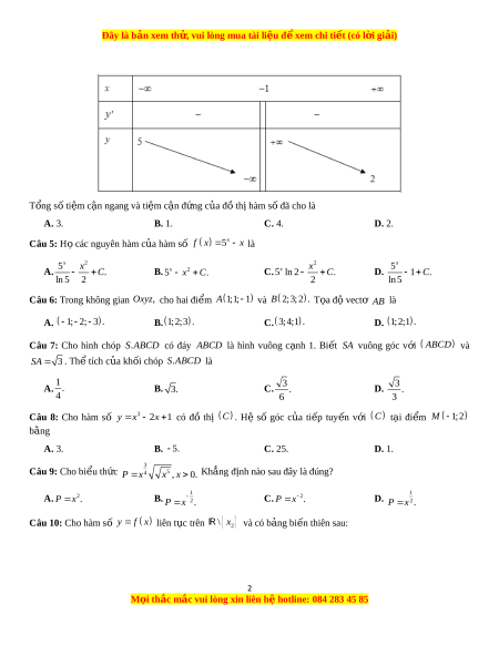 Đây là bản xem th , vu ử i lòng mua tài li u ệ đ xe ể m chi ti t ế (có l i ờ gi i ả ) T ng ổ s t ố i m ệ cận ngang và ti m ệ cận đ ng ứ c a ủ đồ th hà ị m s đã ố cho là A. 3. B. 1. C. 4. D. 2. Câu 5: H c ọ ác nguyên hàm c a ủ hàm s ố 5x