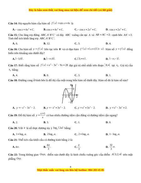 Đây là bản xem th , vu ử i lòng mua tài li u ệ đ xe ể m chi ti t ế (có l i ờ gi i ả ) Câu 14: H nguyê ọ n hàm c a ủ hàm s ố f x s