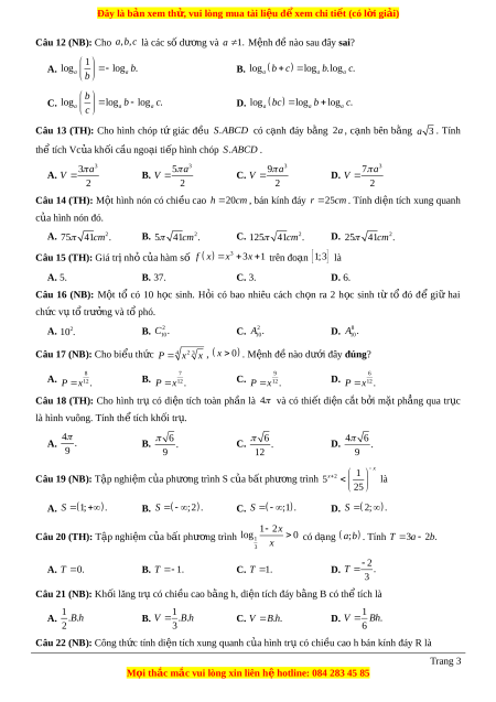 có dạng a;b . Tính T 3 a 2 . b x 3 2 A. T 0 . B. T 1. C. T 1 . D. T . 3 Câu 21 (NB): Kh i ố lăng trụ có chi u ề cao bằng h, di n t