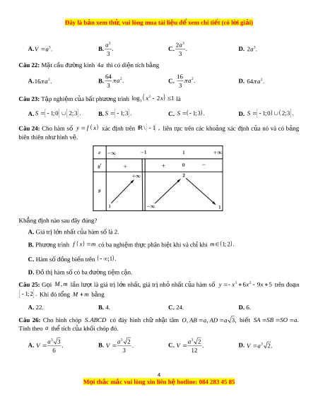 ờ kính 4a thì có di n t ệ ích bằng 64 16 A. 2 16 a . B. 2 a . C. 2 a . D. 2 64 a . 3 3 Câu 23: Tập nghi m ệ c a ủ bất phư ng t ơ rình log 2 x 2x 1 3 là A. S 1; 0 2; 3 . B. S 1; 3 . C. S 1;3 . D. S
