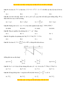 Câu 16: Trong các hàm s s ố au, hàm s nà ố o ngh c ị h bi n t ế rên ? x 2 x e A. y 3 . y l og x . B. y . C. 2 y l og x . D. 5 3 4 Câu 17: Kh i ố lập phư ng ơ có t ng ổ di n t ệ ích các m t ặ là 24 thì th t ể ích b ng ằ A. 8. B. 9. C. 6 6. D. 3 3.