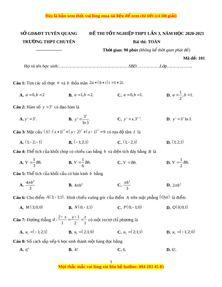SỞ GD&ĐT TUYÊN QUANG Đ Ề THI T T Ố NGHI P Ệ THPT L N Ầ 3, NĂM H C Ọ 2020-2021 TRƯ N Ờ G THPT CHUYÊN Bài thi: TOÁN ------------------ Th i