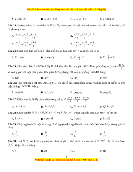 Đây là bản xem th , vu ử i lòng mua tài li u ệ đ xe ể m chi ti t ế (có l i ờ gi i ả ) A. u 1; 2 ;1 . B. u 1; 1; 2 C. u 2; 2; 1 D. u 1;1; 2 Câu 23: Đư ng ờ th ng ẳ đi qua đi m