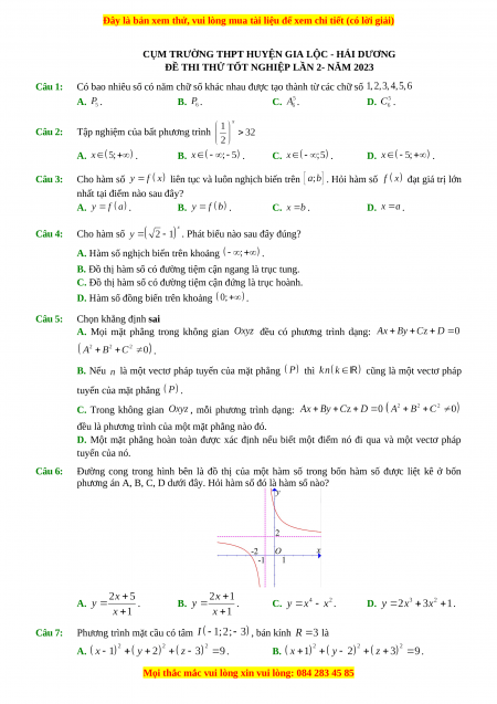 Đề thi thử Toán trường Cụm Gia Lộc - Hải Dương năm 2023
