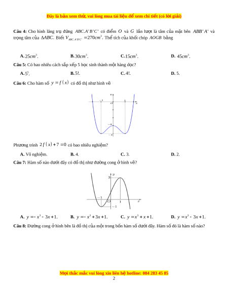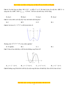 ơ trình 2 f x 7 0 có bao nhiêu nghi m ệ ? A. Vô nghiệm. B. 4. C. 3. D. 2. Câu 7: Hàm s nà ố o dư i ớ đây có đ t ồ hị nh đ ư ư ng ờ cong hì ở nh v ? ẽ A. 3