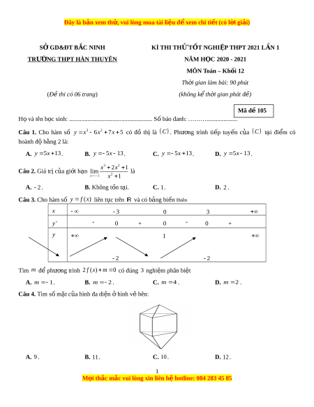 Đây là bản xem th , vu ử i lòng mua tài li u ệ đ xe ể m chi ti t ế (có l i ờ gi i ả ) SỞ GD&ĐT B C Ắ NINH KÌ THI TH Ử TỐT NGHI P Ệ THPT 2021 L N Ầ 1 TRƯ N Ờ G THPT HÀN THUYÊN NĂM H C Ọ 2020 - 2021