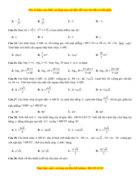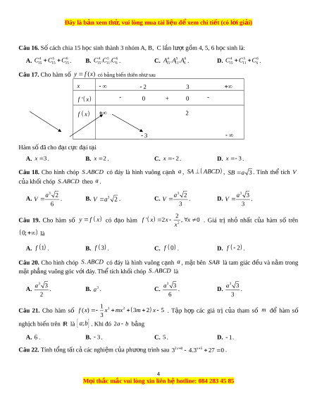 ố chóp S. ABCD là 3 a 3 3 a 3 3 a 3 A. . B. 3 a . C. . D. . 2 6 3 1 Câu 21. Cho hàm số 3 2 f (x)