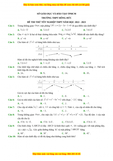 Đề thi thử Toán trường Hồng Đức - HCM năm 2023