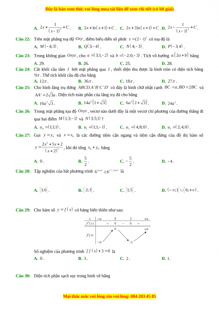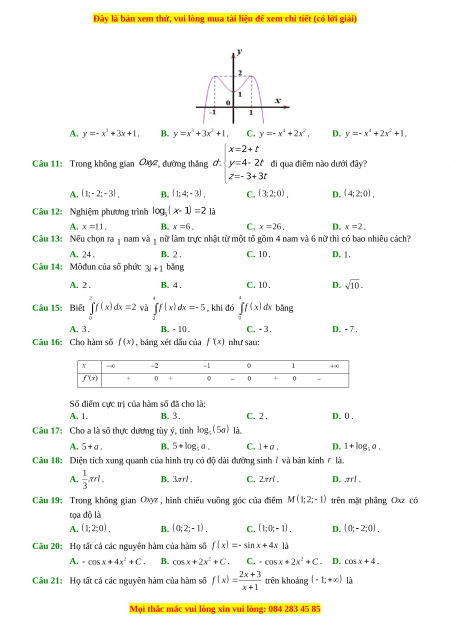 Câu 14: Môđun của số phức bằng A. . B. . C. . D. . Câu 15: Biết và , khi đó bằng A. . B. . C. . D. . Câu 16: Cho hàm số , bảng xét dấu của như sau: